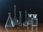 Ensemble de 5 articles de verrerie de laboratoire, comprenant un erlenmeyer et une fiole jaugée. Hauteur : 13,5 à 25,5 cm, diamètre : 3,5 à 11,5 cm => voir aussi notre site web pour des autres obje