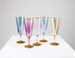 Ensemble de 5 verres en verre irisé de couleur pastel avec un bord doré sur le dessus et une base dorée. Quelques traces d'usure, voir photos. Hauteur 16,5 cm, diamètre 6 cm www hethuisvanmijnmoed