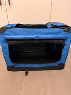 Blauwe hondenreisbench. Niet veel gebruikt. Het matje voor in de bench is niet gebruikt. Lengte is 60 cm, hoogte is 40 cm en diepte is 42 cm. In goede
