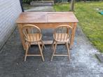 Heel tof schoolbankje, veel plezier aan gehad maar de kinderen zijn er te groot voor geworden. Gebruikte staat lengte 129,5cm hoogte 83 cm diepte 52 cm stoeltjes (waarvan één gescheurd maar door herst
