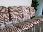 4 nieuw gestoffeerde stoelen in een prachtige roestkleur met beige print. De stof is in relief met fluwelen print. De mousse werd ook volledig vernieuwd. Chrome onderstel werd opgepoetst.
