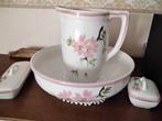 Te koop lampetkan met wasteil, zeepbakje en kammenbakje in keramiek ,wit met roze bloemen, in zeer goede staat ongeveer 45 jaar ou