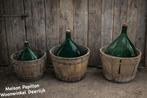 Echte oude dame jeanne flessen recht uit het italiaanse platteland, zeer oud te zien aan de fleshals die is afgesneden tijdens het glasblazen. 1) H55 b35. 40€ 2) h65 b45. 45€ 3) h75 b45. 50&