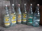 Decoratieve franse vintage glazen limonadeflessen uit de jaren 50-60, van het franse merk phenix en 1 van la sextienne zo leuk om mee te decoreren ... Beschikbaar : 6 flessen, waarvan 4 gele, 1 groene