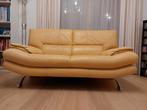 Petit canapé en cuir jaune très confortable et en très bon état. Couleur jaune ensoleillé mais assez doux. Pieds avants en aluminium. 160 Cm de largeur, accoudoirs inclus. Très petites traces d'us