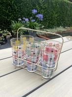Panier en acier avec 6 verres à boire, joliment décorés avec des bords dorés des années 1950. Les verres sont intacts.