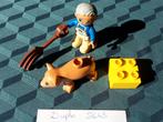 Zelf samengestelde set met allerlei duplo blokjes, bestaande uit: bob de bouwer, poes titus, steekwagentje, graaflaadmachine, bulldozer, kruiwagen, gedrukt bakstenen muurtje, katrol, dranghek, 2 kegel
