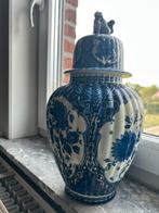 Magnifique vase et couvercle en porcelaine classique de style bleu et blanc de delft blue. Le vase est richement décoré de motifs floraux et possède une élégante statue sur le couvercle. • style