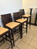 Barkrukken 9 stuks, 2 verschillende hoogtes. Houten frame met skai zitting. De zitting is nog in perfecte staat, houten frame heef