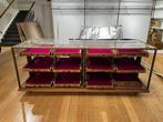 Te koop: een prachtige vintage houten etalagekast met meerdere uittrekbare lades bekleed met bordeaux fluweel. Perfect voor het te