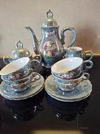 Service à thé en porcelaine. Décorations imprimées représentant des scènes de l'époque de grand-mère. Ce service comprend une théière, un sucrier, un pot à lait, 4 tasses et des soucoupes.