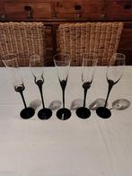 Sublime lot de 5 flûtes à champagne soufflées à la main, au design très élégant. Le verre transparent élancé et le pied noir brill