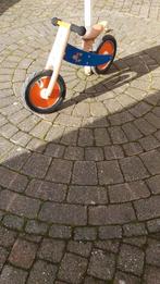 Houten loopfiets''scratch'',in zeer goede staat en op luchtbanden.blauw van kleur met rode wielen.aanpasbaar in gr