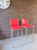 Tabourets de bar en métal, peints en gris métallisé et recouverts de cuir rouge. 43 X 43 x 111 cm hauteur du siège 80 cm