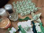 Set doopsuiker driehoek plantenthema doosjes 37 stuks rechthoek plantenthema doosjes 45 stuks vierkant groen lint 28 stuks doopsuiker grijs 1 potjes 900gr - 10/2026 doopsuiker hartjes wit 900 gr - 07/