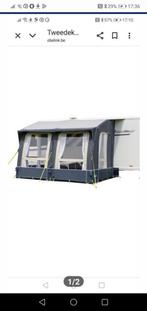Voortent met stevige doek.zonder stokken. Opblaasbaar. Pomp bijgeleverd. Alle ramen kunnen eruit. Kunnen ook tot halfweg opengelegd worden als het warm wordt. Gordijntjes als nieuw. Niet gebruikt. Ten