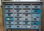 Brievenbussenblok met 4 x 6 = 24 brievenbussen met op maat gemaakt sokkel en rondom bescherming in roestvrij metaal. De brievenbussen kunnen uit de sokkel worden gevezen. Mag weg wegens levering post