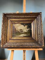 Schilderij op canvas, landschap met dorp met vijver en bomen. Majestueuze kader. F.delahaye xix e siècle, incl kader 60/55, canvas 32/26cm.