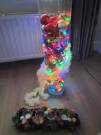 Grote vaas 70 cm hoog en 19 cm doormeter , gevuld met kerstballen en werkende verlichting met verschillende standen. En tafeldecor