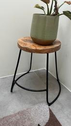 2 krukjes met een mooi houten zitvlak, en stalen poten. Geeft een leuke industriële look. Er zit wat roest op de poten dat behandeld kan worden.