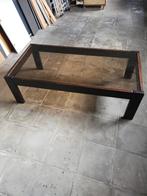 Table basse vintage en chêne. Verre de couleur marron. Dimensions : longueur : 1m40, largeur : 70 cm, hauteur : 40 cm