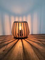 Handgemaakte designlamp uit dennenhout met natuurlijke kleur en voorzien van warmkleurige led. Afmetingen: h:18,5cm b: 21cm (diame