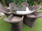Tuintafel met 6 stoelen en kussens ,zeer goede en stevige kwaliteit met glazen deksel op de tafel (stevig). Kussen overtrek wasbaa