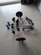 2 × dumbbell van 10 kg 2 x dumbbell van 5 kg 2 × dumbbell van 3kg 2 x schijf vanb10kg 1 x bar vanb 150 cm - 13kg + gratis stepper.