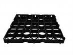 Kunststof grastegels 50x50x4cm zwart belastbaar tot 105t/m2 de tegels worden verbonden met een schuifhaak systeem aan 2 zijden met telkens 3 haken. Ideaal voor de aanleg van een groene parkeerstrook,