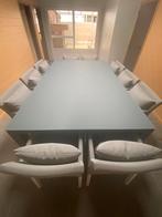 Grote glazen tafel met 10 bijhorende stoelen te koop. Afmetingen: 2m40 x 1m50 x 76cm zowel de tafel als stoelen zijn gemaakt tegen buitenweer. Tafel is altijd beschermd geweest met een dikke tafelbesc