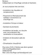 Bonjour, indépendant zed chaufge&sanitaire je propose mes services voir photo à prix honnête, travaille propre et rapide n'hésitez pas à me c