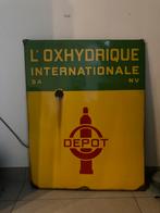 L'image montre un panneau d'affichage émaillé vintage de « l'oxhydrique internationale sa nv ». Le panneau est vert et