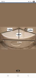 Je vends une baignoire d’angle en bon état. Dimensions : côtés 1,45 m, façade 2,05 m, profondeur 1,65 m (voir photo).