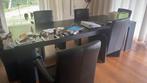 Degelijke tafel van hout en 8 lederen stoelen met wieltjes tafel 2,7 m