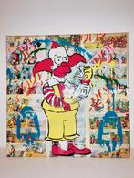 Pop art / street art kunstwerk van de nederlandse kunstenaar koen betjes. Toont krusty the clown (the simpsons) in de kledij van ronald mcdonald (mcdonald's). Onderaan worden de monkeys van banksy