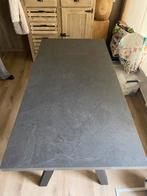 Mooie, moderne eettafel in uitstekende staat. Massief blad (donkergrijs, natuursteenlook) met stevige metalen poten in industriële stijl. Zeer stabiel
