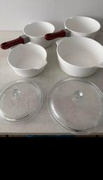 4 casseroles, 2 couvercles et 2 poignées amovibles. Convient à toutes les sources de chaleur autres que l'induction. Je peux y