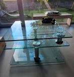 Table basse unique en verre trempé. Peut être ouvert de différentes manières, voir vidéo et photos. 80 Cm de large et 42 cm de haut. Bon état, traces d'usure.