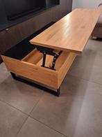 Openklapbare salontafel, moet weg vanwege plaatsgebrek, in perfecte conditie. 35Hx60bx110l materiaal: houtfineer (eik) en zwart glas.