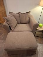 Stoffe zetel zoals hij op de foto staat zonder tafel. Gezellig zetel, kan ook helemaal gewassen worden . 3Delig in de laatste foto ziet u de afmetingen. De prijs van toen en het aankoop jaar 2019. Red