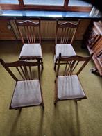 Set van 4 landelijke vintage eetkamerstoelen materiaal : hout , donkere kleur gestoffeerde zitting , beige tint prijs is voor de s