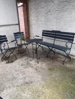 2 oude tuinstoelen in stevige originele staat plus bijzettafel.... Merkteken 'champs elysées....Van fabrikant fermob luxe tuinmeubilair.... Antiek.... Stoelen zijn opvouwbaar....Kan eventueel thui