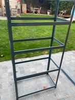 16 rails van 130 cm (1,5€/st) 63 dragers voor planken van 40 cm (1,5€/st) planken: 5 st 76,5 x 40 (4€/st) 18 st 100
