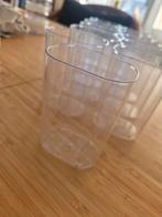 Transparante kunststof 12 bakjes van 10cm hoog en 5cl breed, handig als mengbeker of lade/ kastorganizer. Geschikt voor keuken, badkamer, bureau of diy licht gebruikt, in prima staat. Verkoop als set.