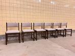 Bekijk gerust onze instagrampagina voor meer vintage meubels en verlichting: @studio_loe_vintage 🤗 leuke set van zes vintage stoelen in donker hout met een zitting en rug in een zandkleurige bouclé.