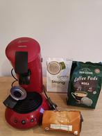 In werkende staat, met de 2 bijhorende pads (voor 1 en voor 2 tassen). Nog 2 volle en 1 gebruikte zak koffiepads.