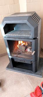 Houtkachel met speksteen. Afmetingen: 56 cm breed, 42 cm diep, 97 cm hoog, hart uitlaat 81 cm. 6 Kw tot 9 kw glas en koord werden