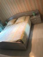Composition : - le lit (sans le matelas) : sommier à lattes pour matelas de 160 x 200 cm. Tête de l 276 x h 90 cm. Prix souhaité : 100€. - Les 2 tables de nuit : dimensions : l 56 x p 40 x h 43 c