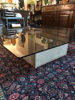 Uniek exemplaar, ontwerp uit 1985. Onderstel: 60x60x30 cm topblad: 120x120 cm (fuméglas) zwaar stuk. Twee mensen nodig om het te v