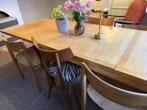 Eettafel, 165 cm lang, te verlengen naar 220 cm, 85 cm breed. Ze is licht beschadigd, we verkopen ze met de 6 bijpassende stoelen met rieten zitvlak. Aan de stoelen is er wel wat werk. Voor iemand die